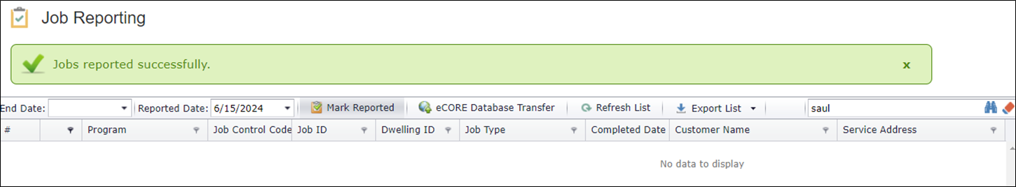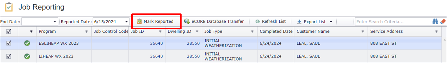Step 8: Return to Job Reporting page (Weatherization > Weatherization Admin > Job Reporting) and click "eCORE Database Transfer". Any jobs already marked reported will be transferred.