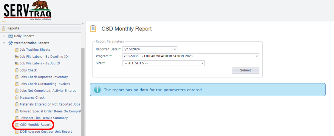 Step 6: Go to Reports > Weatherization Reports > CSD Monthly Report. Select the Reported Date (from Step 4), Program, and Site